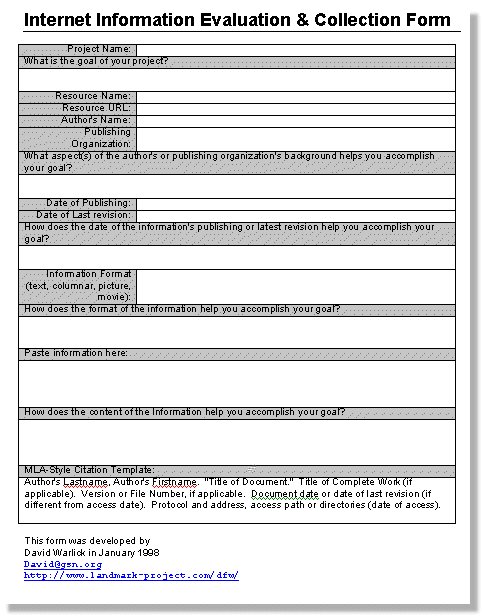 | Internet Evaluation Form | The form below has been created to help students evaluate Internet